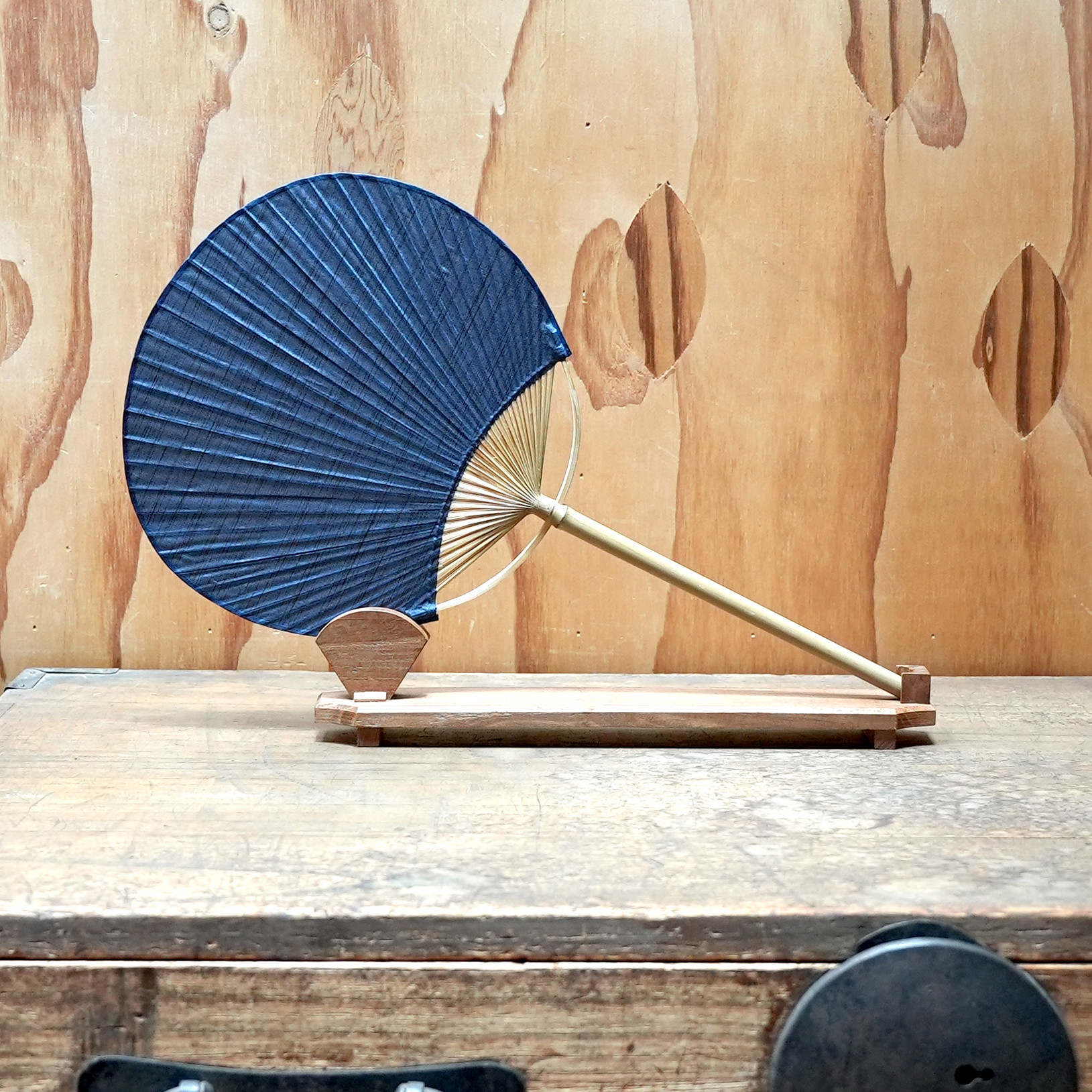 途絶えた伝統復活「甲斐絹団扇」紺絣 丸竹柄長小型