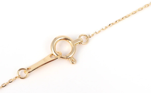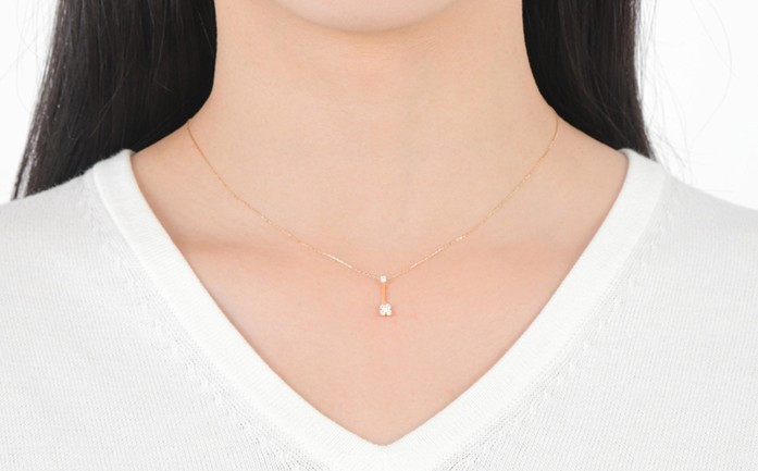 ぶら下がりタイプのK18ダイヤモンドペンダントになります、ダイヤモンドの一つ石の下に、クローバーの花びらが揺れる形になります。ぶら下がりタイプのペンダントは実際にお付け頂いた際に首元にY字ラインが綺麗に出て、胸元をスッキリと見せてくれると思います。