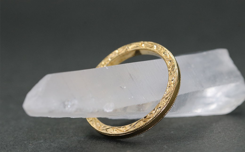 リング全面にミル打ちを施し、側面部分には、唐草模様を手彫り彫刻したリングです。 平うち ミル打ちリング(サイドに唐草)(18金)【号数:7号~15号】 レディース 女性 K18 ジュエリー 指輪 リング 富士川町