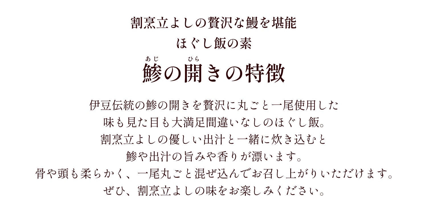 伊豆伝統のアジの開きを贅沢に使い、炊き込みご飯の素に仕立てました。
