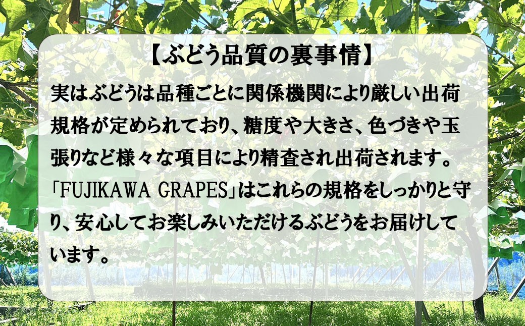 実はぶどうは品種ごとに関係機関により厳しい出荷規格が定められており、糖度や大きさ、色づきや玉張りなど様々な項目により精査され出荷されます。「FUJIKAWA GRAPES」はこれらの規格をしっかりと守り、安心してお楽しみいただけるぶどうをお届けしています。