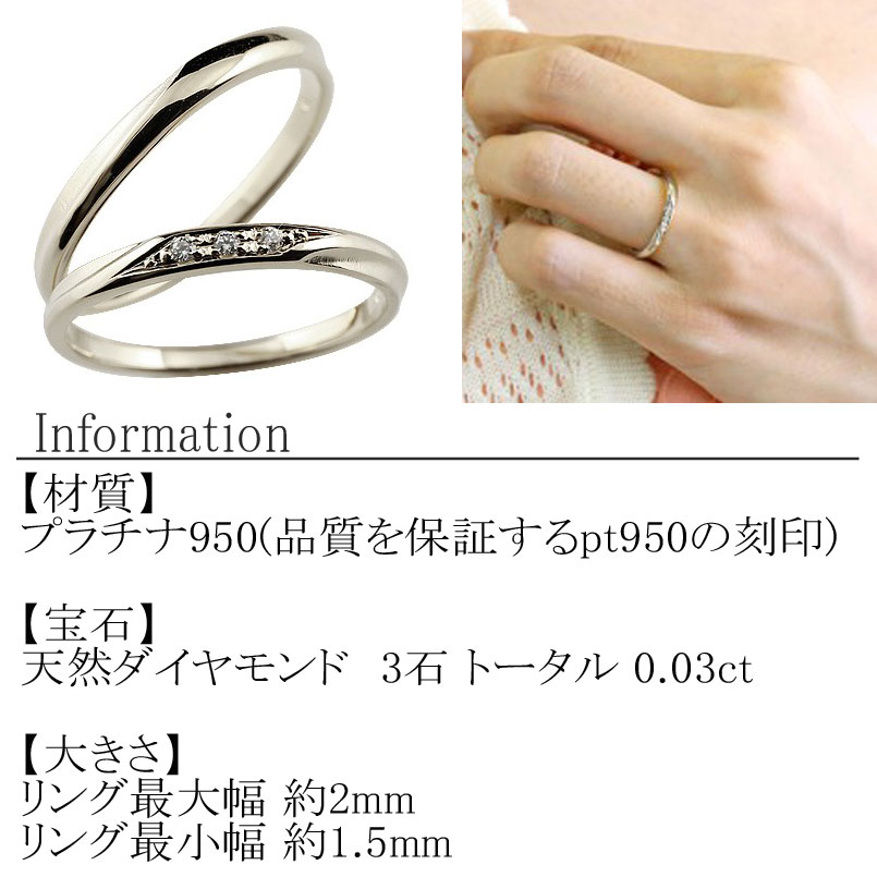 | 容量 | ペアリング ダイヤモンド 2個セット pt950 ・材質 プラチナ950(品質を保証するpt950の刻印) ・宝石名 女性用 天然ダイヤモンド 3石 トータル0.03ct ・大きさ 最大幅 約2ミリ 最小幅 約1.5ミリ |