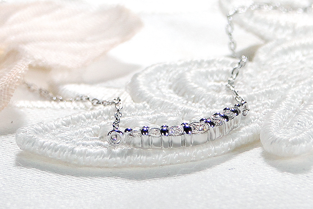 デコルテに沿うように 柔らかなカーブを描く、美しいプチラインのダイヤモンドネックレス。
