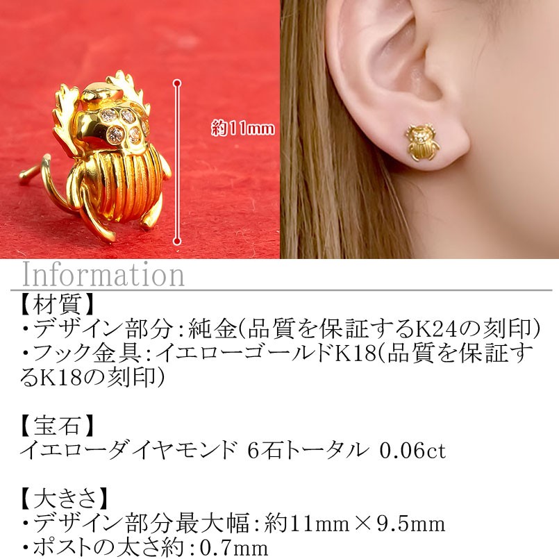 純金 24金 ピアス ダイヤ 片耳 つけっぱなし イエローダイヤモンド スカラベ フンコロガシ キャッチのいらないピアス 縁起物 お守り 金具18金 k18 キャッチナッシャー 18k 人気220415101 SWAA275