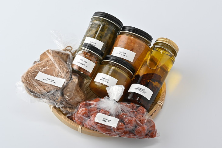| 容量 | 下記から5種おまかせとなります ・梅干/300g ・干し椎茸/50g ・山の唐辛子/20g ・高菜漬け/180g ・柚子味噌/120g ・完熟無農薬ドライTOMATOオイル漬け/200g ・山のおかずみそ/140g |