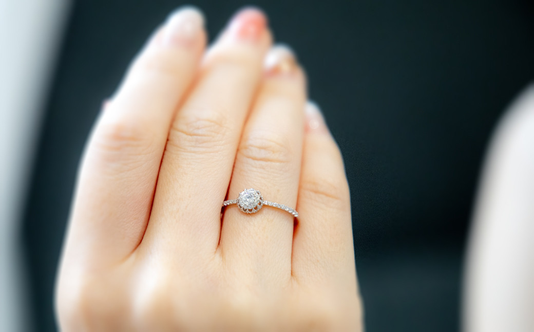 繊細なデザインのリングはどんな装いにも合わせやすく、指本に華やかさをプラス。