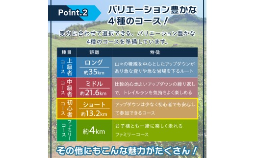 コースはロング(約35km)、ミドル(約21.6km)、ショート(約13.2km)、ファミリー(約4km)の4種類。