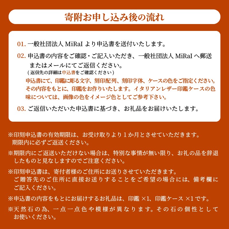 ※申込書の内容をもとにお届けするお礼品は、印鑑×1、印鑑ケース×1です。
