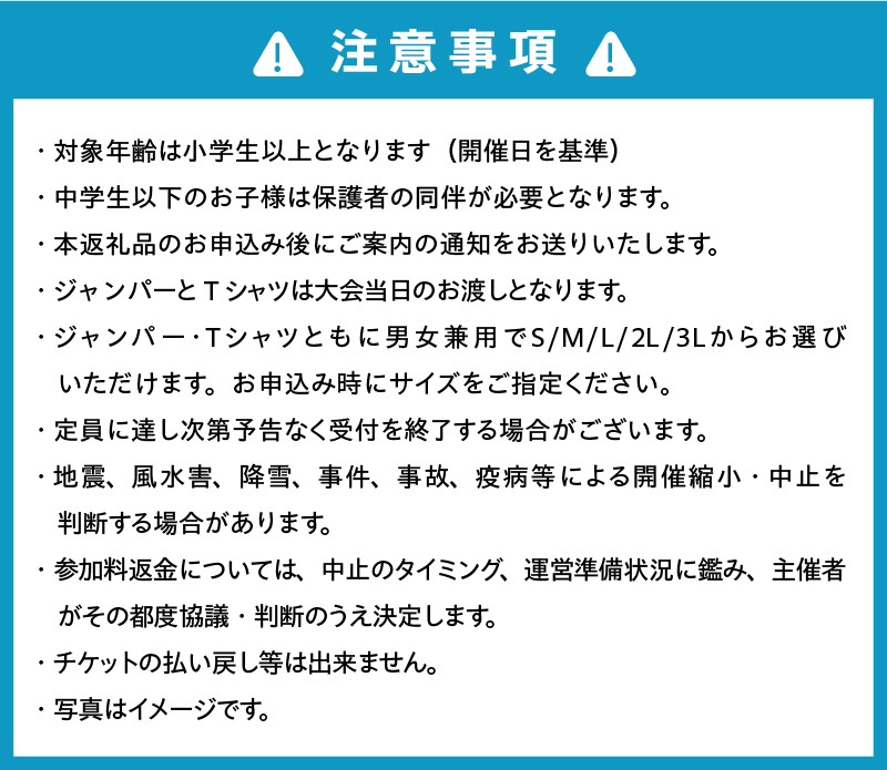 ※ジャンパーとTシャツは大会当日のお渡しとなります。また、サイズを【備考欄】に記載をお願いします。