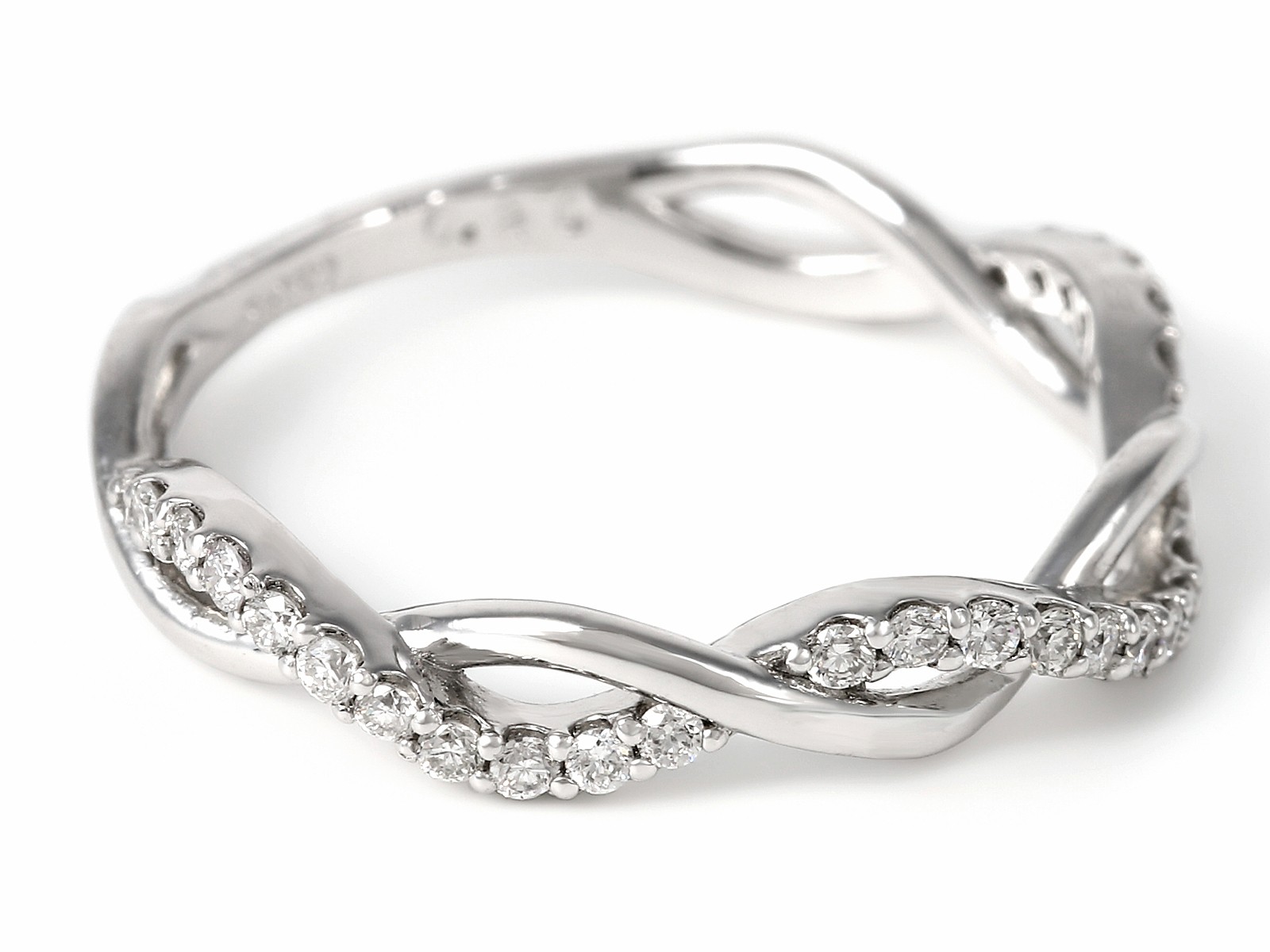 ダイヤモンドとプラチナの地金が絡み合ったデザインはボリューム感がありますが、ほどよい隙間が軽やかさを演出してくれるので洋服にも併せやすい品物になっています。