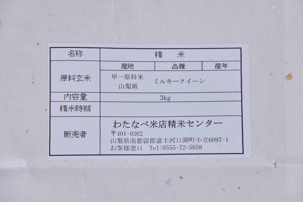 | 容量 | ◆山梨県北杜市産白州米コシヒカリ 無洗米3kg 原産地:山梨県北杜市白州町 原材料:コシヒカリ10割 精米加工地:山梨県富士河口湖町の精米工場にて精米および袋詰め ◆山梨県北杜市産白州米ミルキークイーン 無洗米3kg 原産地:山梨県北杜市白州町 原材料:ミルキークイーン10割 精米加工地:山梨県富士河口湖町の精米工場にて精米および袋詰め ■注意事項/その他 ※到着後は、すぐに開梱して中をご確認ください。 ※風通しの良い涼しい場所で保管し、冷蔵庫など熱が出る機器の横、また流しの下などの、湿気が多い場所には置かないでください。 ※保存容器は、外から虫などが入らないような物にしましょう。 また、室内温度が上がる時期には、冷蔵庫へ入れるのも、おいしさを保つための方法です。乾いたペットボトルに詰め、湿気や虫が入らないようにキャップをし、野菜室での保管がお薦めです。 ※なるべくお早めにお召し上がりください。 |