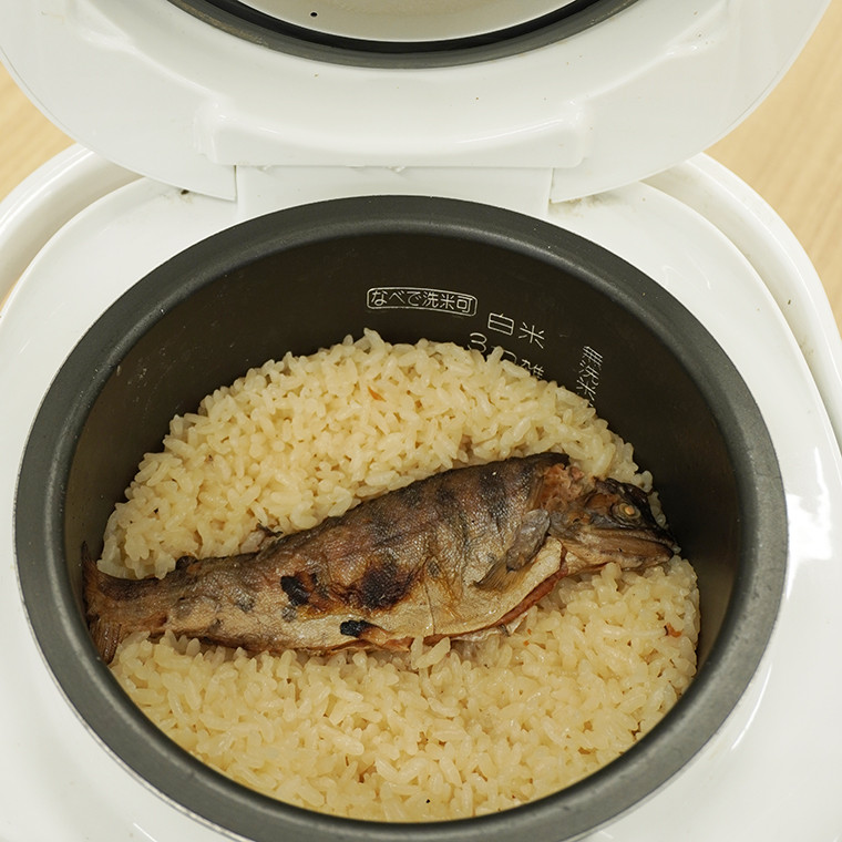 よくよく水切りした米2合とヤマメとダシ汁を一緒に炊くだけです。(季節のお野菜を足してもおいしくお召し上がれます。)