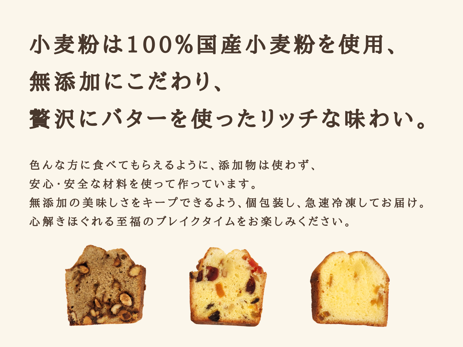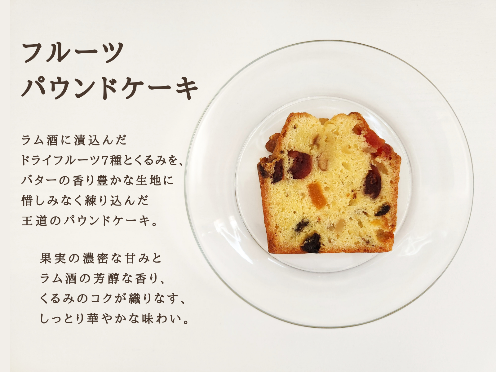 一つひとつ丁寧に焼き上げたパウンドケーキは、大切な方への贈り物や、ご自宅での特別なティータイムでお楽しみください。