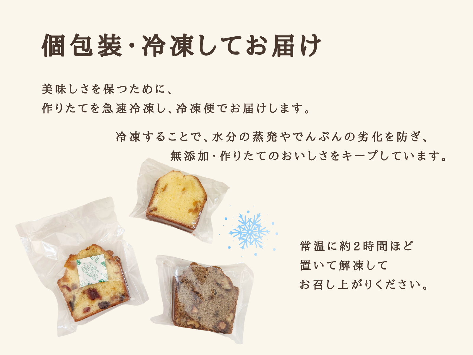 パウンドケーキは作りたての美味しさをキープできるよう、個包装・急速冷凍し、冷凍便にてお届けします。