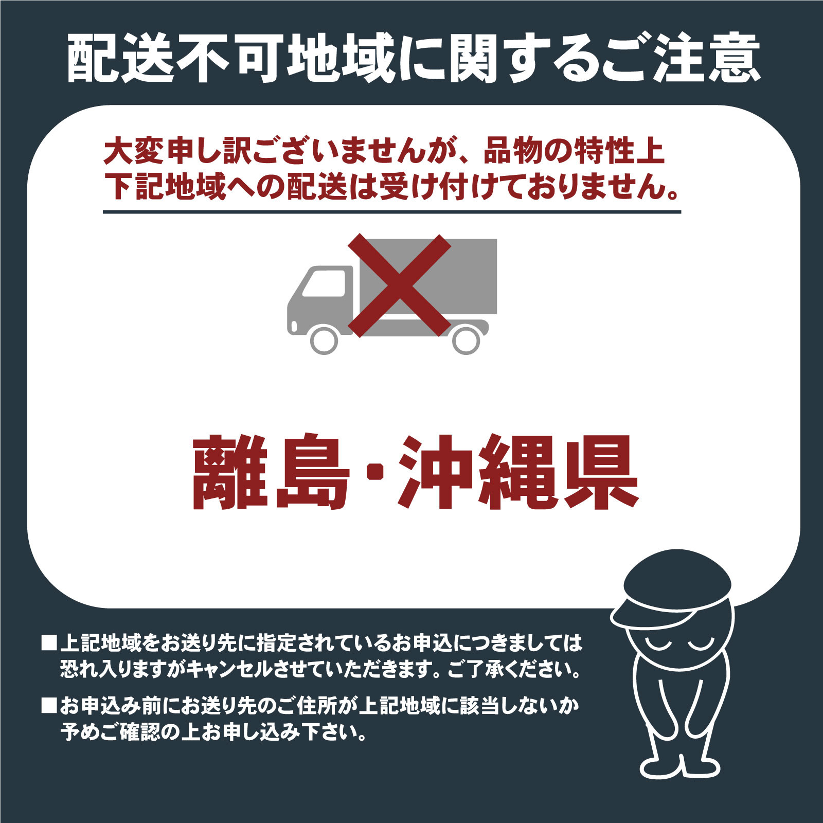 | 発送期日 | ■■来年(2026年)出荷のお品です■■ 2026年7月下旬から8月中にかけて順次発送 ※上記はあくまで目安の時期となります。 ※配達日の指定は受付できません。ご注意ください。 ※申し込み順に順次発送させて頂きます。 ※天候の影響等により収穫量、収穫時期の変動により発送が早まるもしくは遅れる場合が御座います。ご了承ください。 ※クール冷蔵で配送させていただきます。 ※誠に申し訳ございませんが、記載の配送不可地域への発送は、台風などの気象条件の影響を受けやすく、配送日時が長期化してしまうため、万全の状態でのお届けが難しいため、発送を遠慮させていただいております。 ※発送時に発送完了メールを送信いたします。配達日の指定や受取場所の変更などは発送完了メールからも行えます。必ずご確認ください。 ※本品は品物の特性上、宅配ボックスへの配達はできません。 ※お受け取り後は冷蔵にて保管下さい。 ■配送不可都道府県■ 離島,沖縄県 |