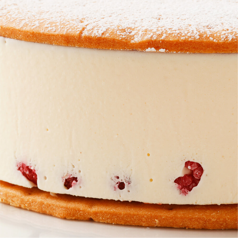 シンプル故に際立つ絶妙なクリーム。北海道産の濃厚な厳選したチーズをサクサクのクッキーでサンドした自信作。中に真っ赤なフルーツをちりばめた久しぶりの新作です。カットすると断面に見える赤い木苺が美味しくも美しいケーキです。粉砂糖を振りかけてお届けいたします。