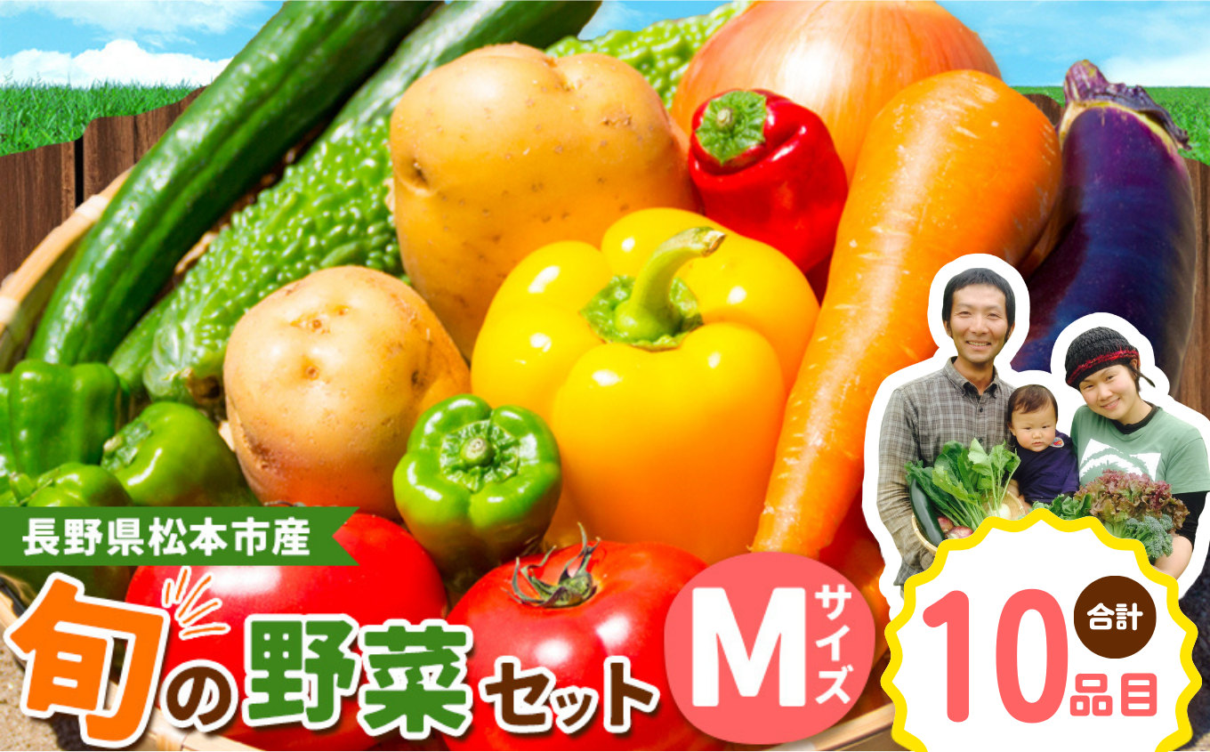 | 容量 | 旬の野菜詰合せMセット(10品目) 事業者名/たべくら農園 産地名/松本市内 〇サイズの選び方〇 ●mini 6品目 お試しの方、ご年配の方、お一人暮らしの方向け ●S 7~8品目 少人数、お子さんが小さいご家庭向け ●M 10品目 中~大人数、毎日料理するご家庭向け ※葉物が多い5~6月は下のサイズを、食べきりやすい夏野菜中心の7月中~9月はサイズUPもオススメです |