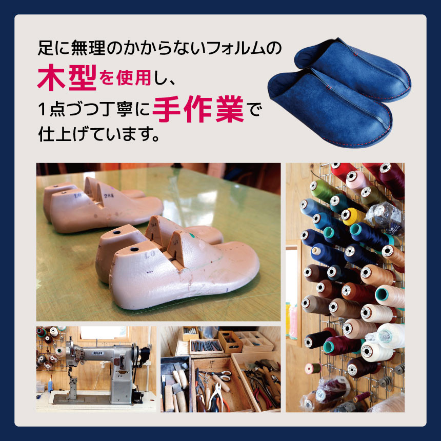 足に無理のかからないフォルムの木型を使用し、1点づつ丁寧に手作業で仕上げています。