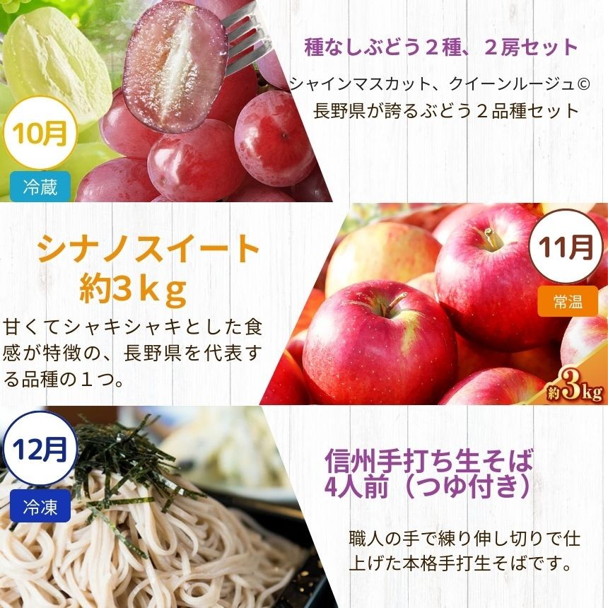 | 容量 | 【定期12回】 1月:信州味噌 酪酸菌入り味噌シリーズ の6種セット 合計1.2kg ( 200g × 6 ) 2月:信州ご当地餃子セット 20個入り×3種 3月:乗鞍高原 天空のバウムクーヘン 『シラカバ』ホールサイズor乗鞍高原 天空のバウムクーヘン 『ツリー』ホールサイズ 4月:松本 地元グルメ 山賊焼き真空パック 3袋セット 5月:信州ご当地ピッツァ 5枚セット 6月:1日分の野菜200ml 24本入り 伊藤園 7月:松本市産 小玉スイカ 2玉 ピノガール 8月:松本市 波田産 大玉すいか 4L(9kg~11kg) 9月:信州産 ナガノパープル、シャインマスカットのセット 約1kg (2房) 10月:信州産 クイーンルージュ®、シャインマスカットのセット 約1kg (2房) 11月:シナノスイート 3kg(6~12玉) 12月:信州手打生そば4人前(つゆ付) |