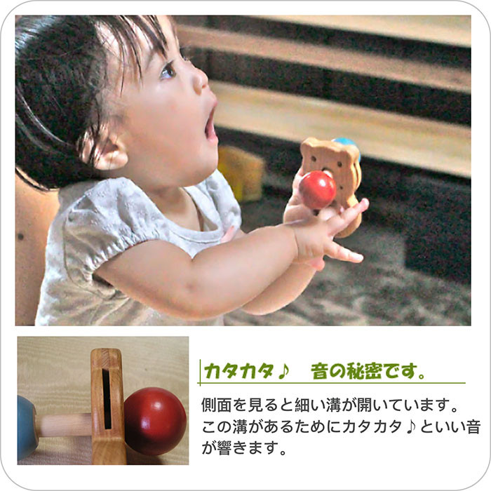 「クマ」をモチーフにしたこの可愛らしい知育おもちゃは、赤ちゃんや子どもたちに大人気です。赤と青のクマの表情は、思わず微笑んでしまうような愛らしさがあります。また、取っ手は丸く大きく作られ、小さな手にしっくりと馴染むようになっています。スベスベの手触りに包まれながら、お鼻を握ってみたり、前後に振ってカタカタと木の音を楽しんだり。この知育おもちゃは、赤ちゃんの五感を優しく刺激してくれます。