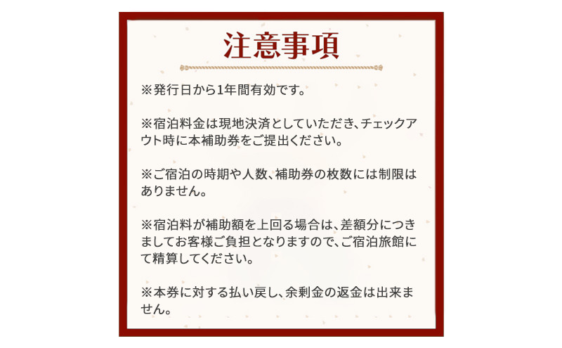 ※宿泊料金は現地決済としていただき、チェックアウト時に本補助券をご提出ください。