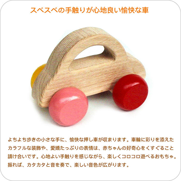 このような車は子供がはじめて出会う玩具のひとつでしょう。 今回はあえておもちゃの原点にかえって考えてみます。 最近は「ひとり遊び」の上手な子供が増えたと言いますが、玩具はもともとはコミュニケーシ ョンを豊かにする生活道具でした。「くるまがお父さんの背中をのぼっているよ」などと話ながらお互いに背中をころころさせてみてください。大人はマッサージのようで気持ちいいですよ。子供さんはくすぐられているような気分かも知れません。御家庭ごとの楽しみ方があると思います。