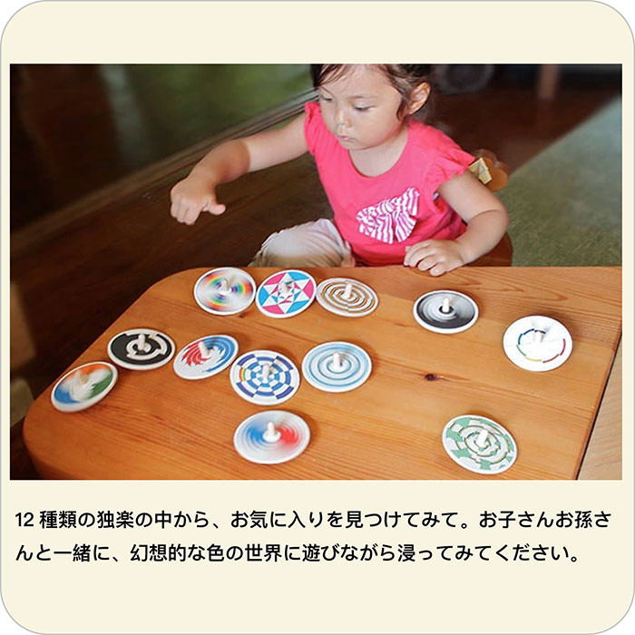 12種類の独楽の中から、お気に入りを見つけてみて。お子さんお孫さんと一緒に、幻想的な色の世界に遊びながら浸ってみてください。