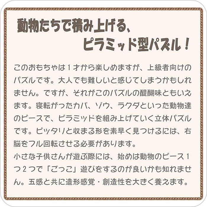 小さな子供さんが遊ぶ際には、始めは動物のピース1つ2つで「ごっこ」遊びをするのが良いかも知れません。2個だけ3個だけの簡単なパズルから始めて、慣れてきたら全てのピースでピラミッドパズルに挑戦してみましょう。 五感と共に造形感覚・創造性を大きく養える、まるで美術品のような素敵なパズルです。