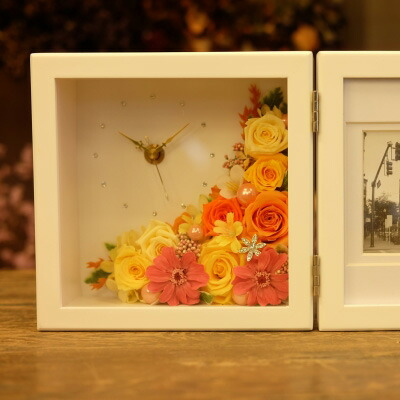 プリザーブドフラワー「時計付きフォトフレーム」をお届けします。
