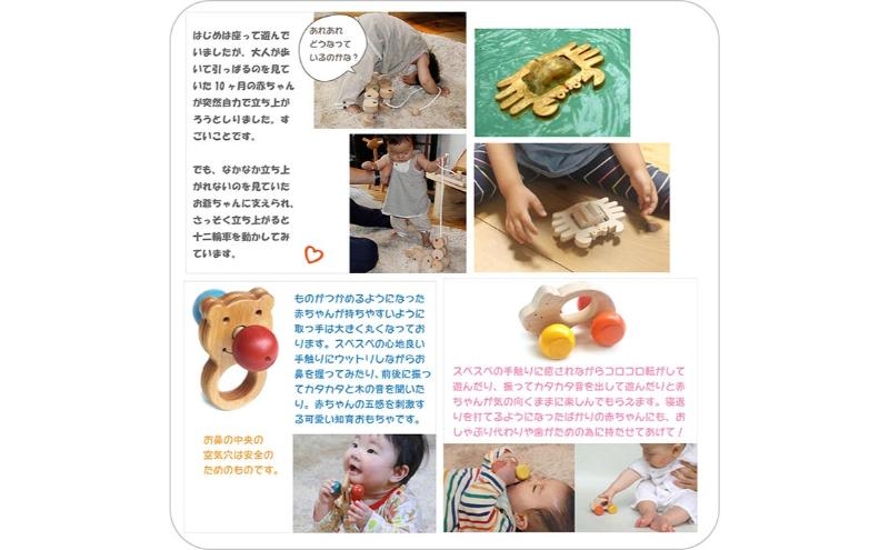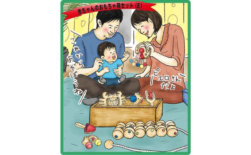 木箱の蓋を開けると、ワクワクする豪華なおもちゃ達が赤ちゃんをお出迎え。小さな手が握ってくれる木のおもちゃ達で味わう幸せの時間を、大切な新しい家族と一緒に楽しんでくださいね。
