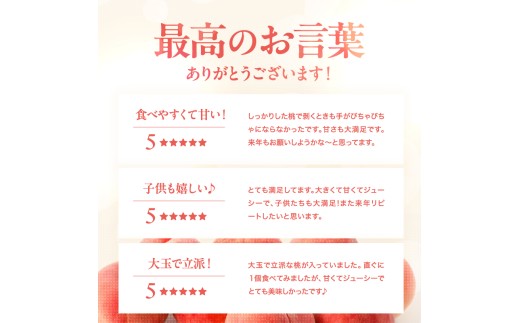 想像していたより大きく、とても甘い桃でした。硬さと甘さのバランスも良好で家族も喜んでいました。是非リピートしたいと思います。