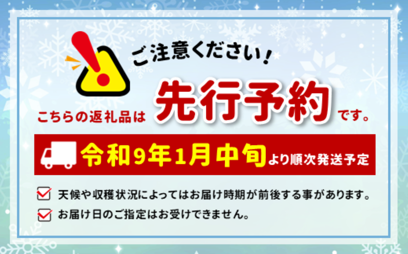 2027年1月中旬~1月末の間で順次発送予定 ※こちらの返礼品は北海道・沖縄・離島への発送はできません。 ※お届け日の指定はできませんので、ご了承ください。 ※長期不在のご予定があれば事務局へご連絡ください。 ※尚、長期不在等によりお礼の品をお受取りできなかった場合、再発送はできません。あらかじめご了承ください。 ※配送業者はヤマト運輸となりますので、配送連絡をご希望の方は、クロネコメンバーズの加入をお勧めいたします。 ※返礼品の配送先住所に変更があった場合には、速やかに事務局までご連絡ください。 ※発送可能時期になり、発送されると、ご寄附時に登録したメールアドレスに「出荷完了メール」が届きます。 ※発送後の場合は、直接、配送業者にお問い合わせください。 ※転送料金がかかる場合は寄附者様のご負担となります。 |