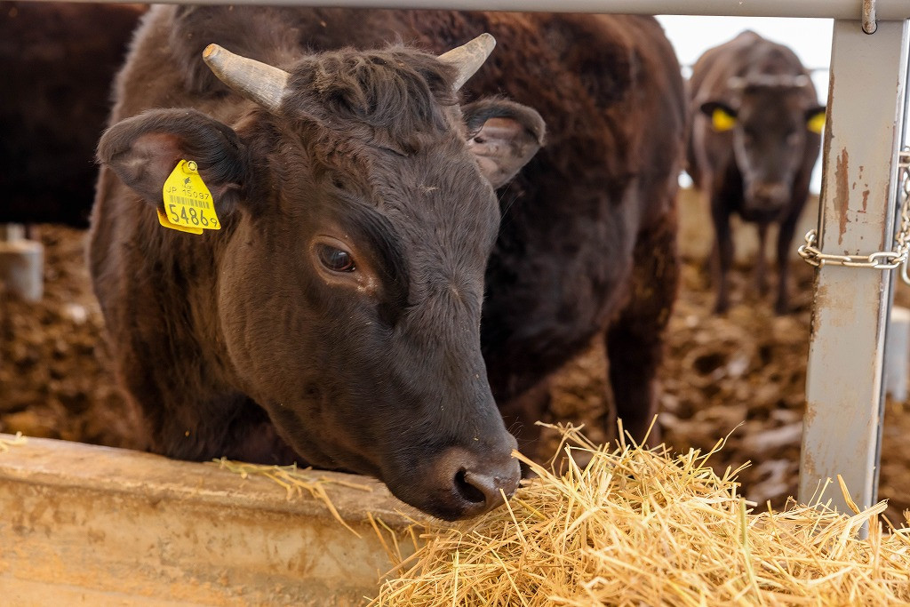 生後8~10ヵ月で導入された子牛は牧草と穀物を食べ、30~36ヵ月かけてじっくり成長します。