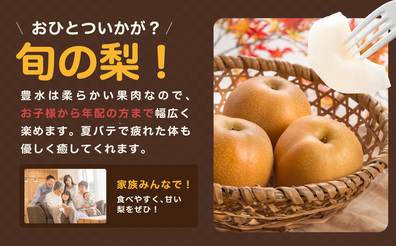 豊水は梨のなかではサイズが大きく、甘味と酸味を程よく持ち合わせている、バランスが取れた梨です。