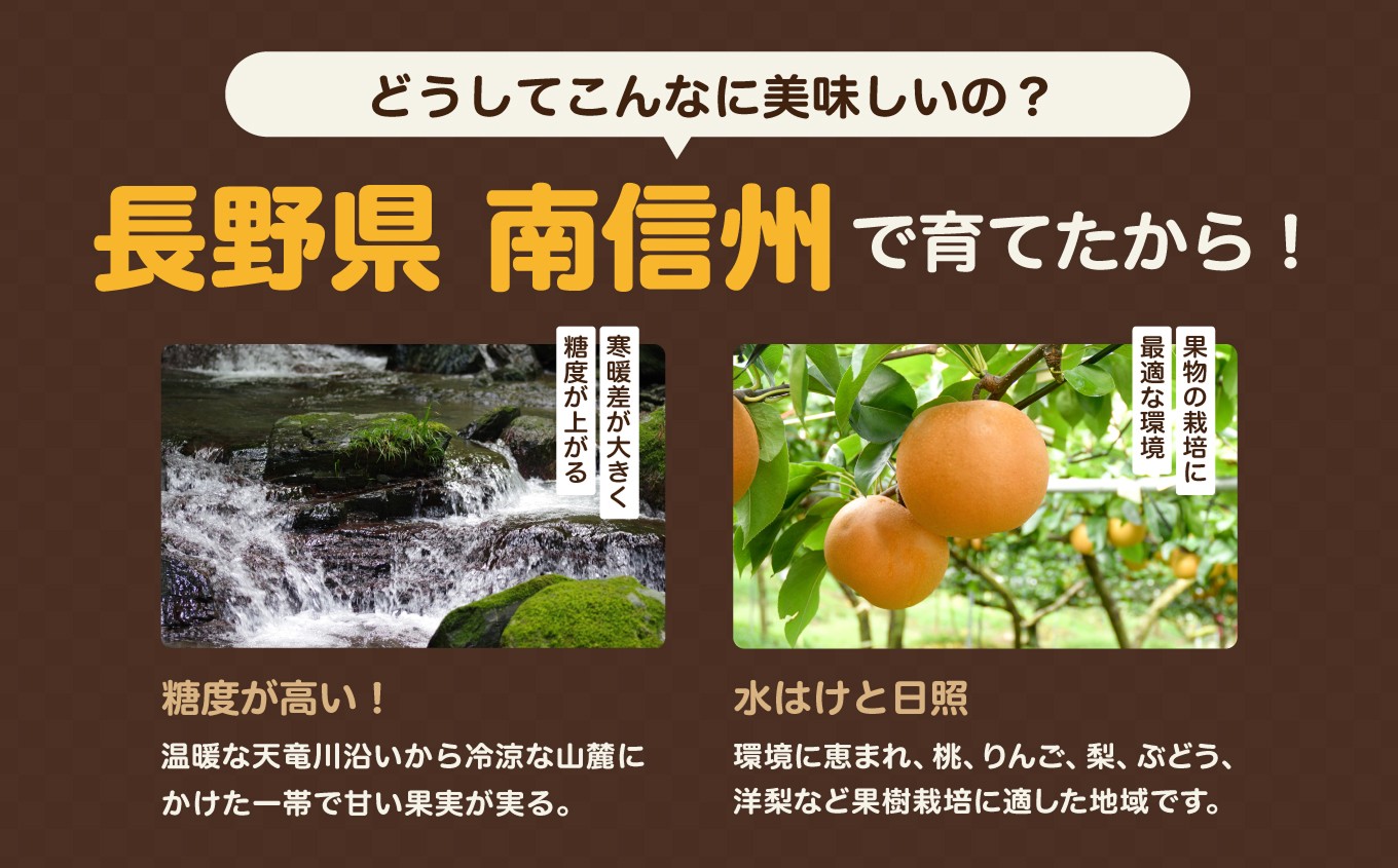 南信州の果樹農家と下伊那園芸農業協同組合が力を合わせて、丁寧に育てた「幸水梨」をお届けします。