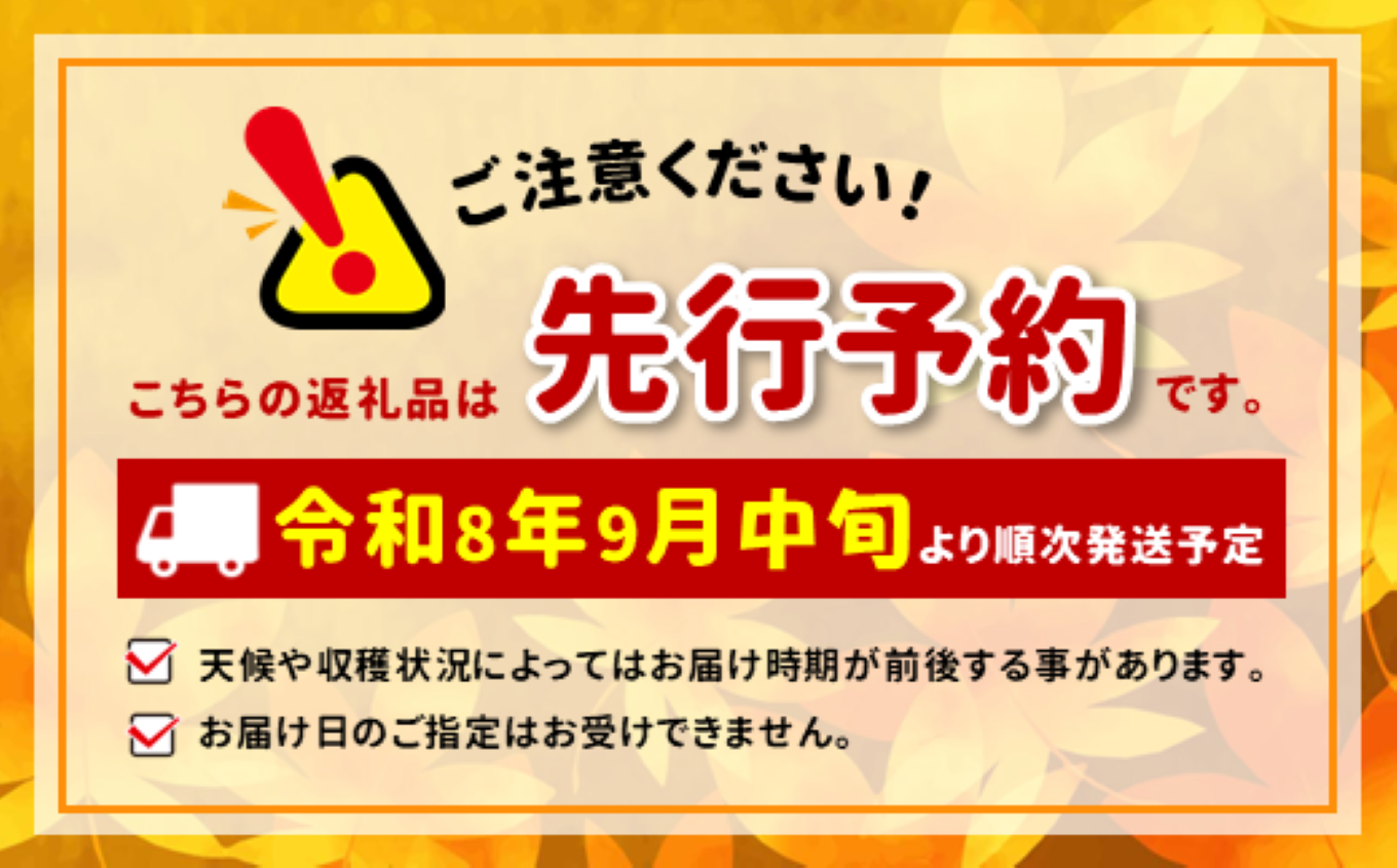 2026年9月中旬~10月中旬の間で順次発送予定です。 ※発送日・到着予定日等のご案内はしておりません。 【発送について】 ※返礼品の特性上、発送時期が前後する場合がございます。予めご了承ください。 ※こちらの返礼品は沖縄・離島への発送はできません。 ※お届け日の指定はできませんので、ご了承ください。 ※長期不在のご予定があれば事務局へご連絡ください。 ※尚、長期不在等によりお礼の品をお受取りできなかった場合、再発送はできません。あらかじめご了承ください。 ※配送業者はヤマト運輸となりますので、配送連絡をご希望の方は、クロネコメンバーズの加入をお勧めいたします。 ※返礼品の配送先住所に変更があった場合には、速やかに事務局までご連絡ください。 ※発送可能時期になり、発送されると、ご寄附時に登録したメールアドレスに「出荷完了メール」が届きます。 ※発送後の場合は、直接、配送業者にお問い合わせください。 ※転送料金がかかる場合は寄附者様のご負担となります。 |