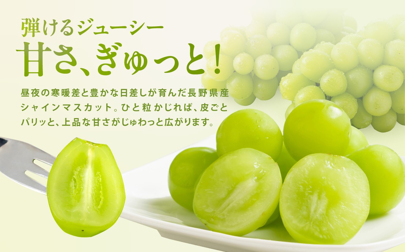 大粒で種なし、皮ごと食べられる氷温貯蔵シャインマスカットを是非ご賞味ください。