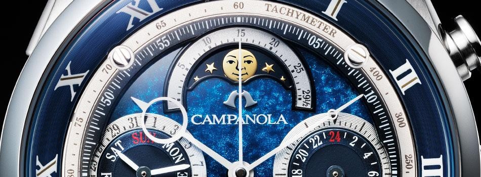 月の満ち欠けを表現するムーンフェイズ。 カンパノラのムーンフェイズは約29.5日の周期にあわせて2つの表情の月が交互に姿を現わし、見る人の目をなごませます。