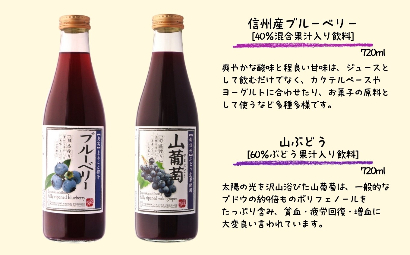 | 容量 | すりおろしりんごジュース(1000ml)×1本 りんごジュース(1000ml)×1本、 トマトジュース(1000ml)×1本 人参とりんごジュース(720ml)×1本、 信州産ブルーベリー[40%混合果汁入り飲料](720ml)×1本 山ぶどう[60%ぶどう果汁入飲料](720ml)×1本 6種類6本 |
