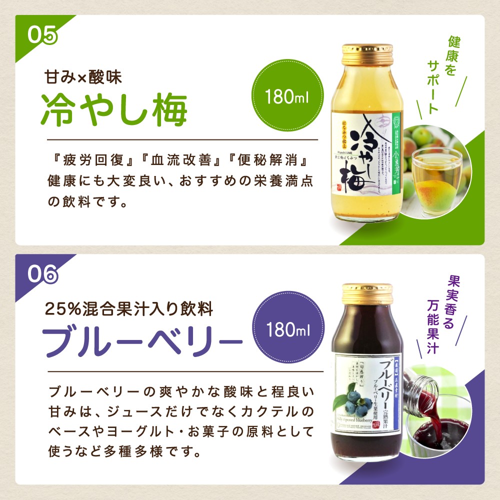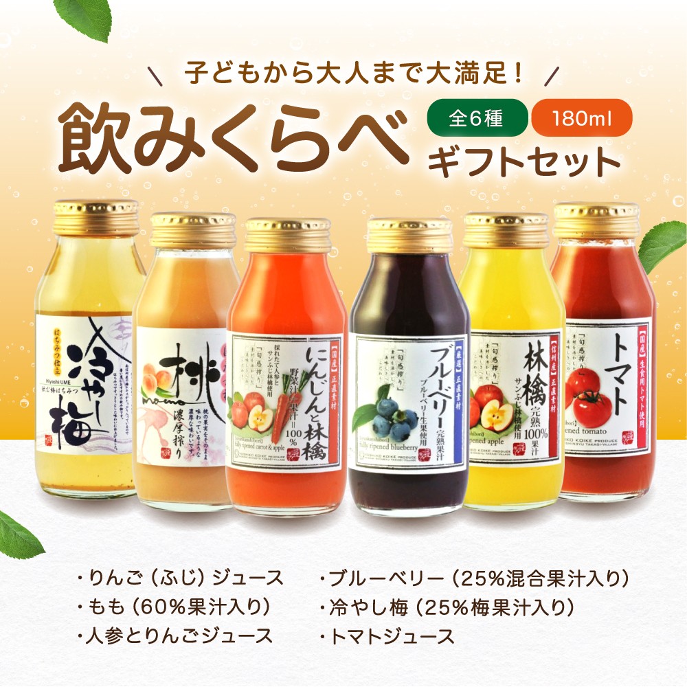 | 容量 | ブルーベリー[25%混合果汁入り飲料](180ml)×1 冷やし梅[25%梅果汁入り飲料](180ml)×1 人参とりんごジュース(180ml)×1 トマトジュース(180ml)×1 桃[60%桃果汁入り飲料](180ml)×1 りんごジュース(180ml)×1 6種類6本 |