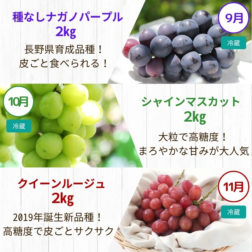 | 容量 | 1回目 9月上旬頃発送 【長野県産・種なしナガノパープル(約2kg) 秀品】 2回目 10月上旬頃発送 【長野県産・シャインマスカット(約2kg) 秀品】 3回目 11月上旬頃発送 【長野県産・クイーンルージュ(約2kg) 秀品】 ※発送時期は目安です。生育状況により該当月から前後する場合があります。 ※各々3~5房を目安にお届けします。入数はご指定できません。 |