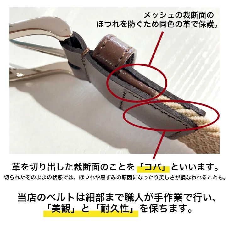 職人の手作業により細部まで高品質に仕上げたストレッチメッシュベルトです。