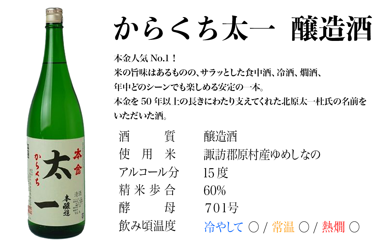本金を50年以上の長きにわたり支えてくれた北原太一杜氏の名前をいただいた酒。すっきり辛口の酒質は多くの方に愛され、今では「本金といえば太一!!」と言われるようになった本金の看板商品です。