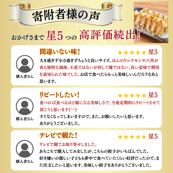 口に入れたときの【香り】がこの餃子の最大の特徴なのですが、シナモンや八角などが入っていて独特な味わいなので『この餃子がダメ』という人も多少います。