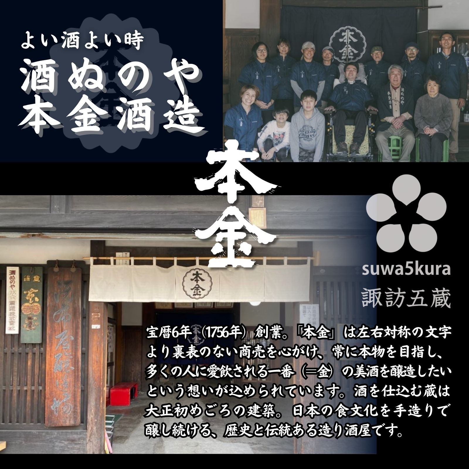 諏訪に生まれ、蔵元と親交のあった画家・原田泰治氏の作品「野良仕事」をラベルにあしらいました。甘み酸味など、様々な味わいが溶け込んだ綺麗な酒です。「本金は“野良”だね」という原田氏の言葉が、信州の自然を映す一杯となって息づいています。