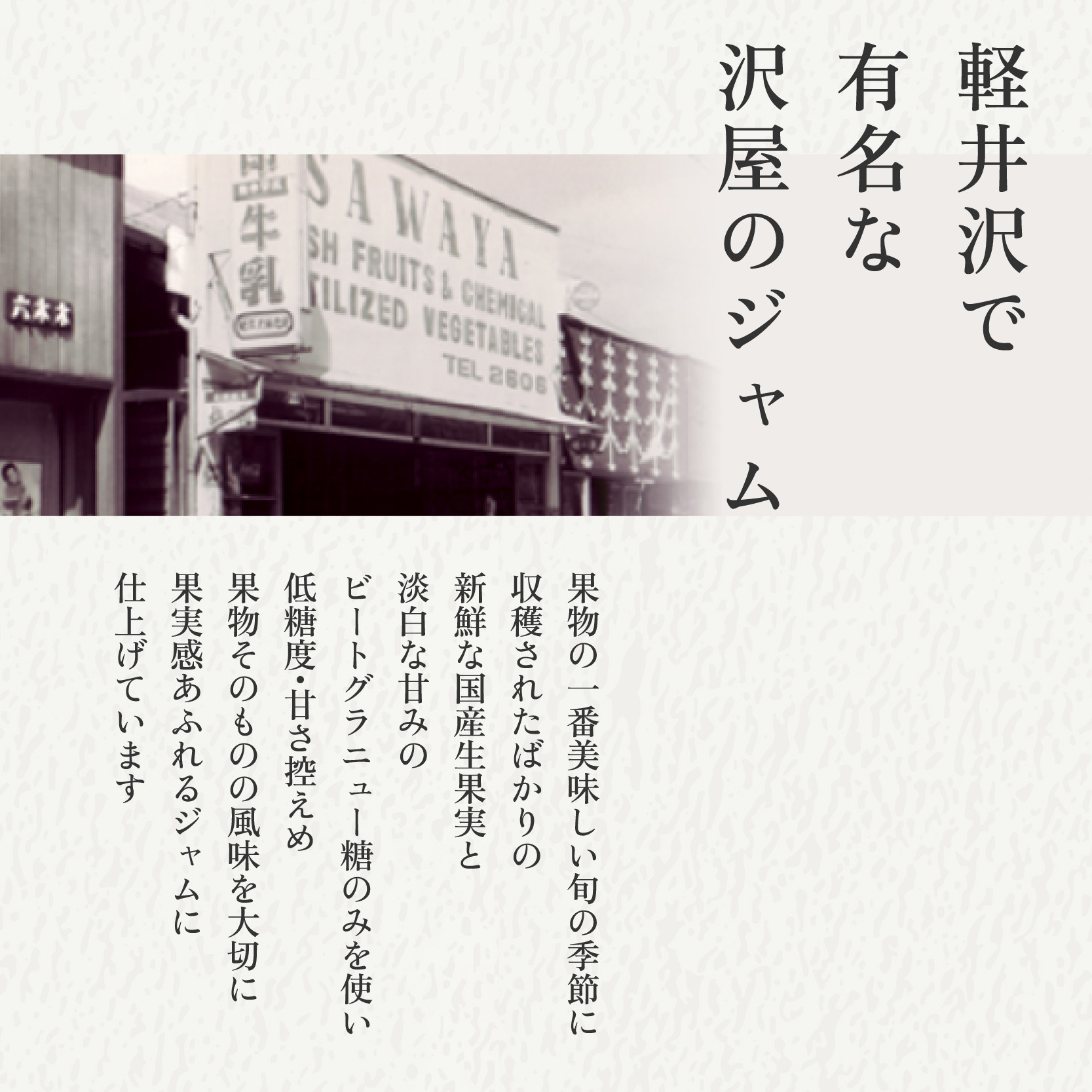 1952年に旧軽井沢テニスコート通りに看板を掲げた小さな青果店。滞在する外国人宣教師や外国大使別荘の方々へ新鮮な野菜や果実を納めていた沢屋では、お客様のご要望で無添加・低糖度の手作りジャムを作り始めます。当時は甘いジャムが多い中、低糖度で甘さ控えめのジャムは口コミで評判を呼び、いつしかジャム専門店に生まれ変わりました。