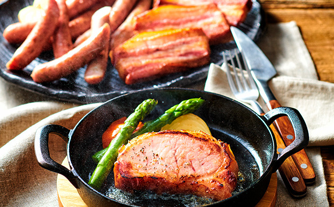 信州十四豚の加工品には、醤油漬けでうま味を出した「生ハム」、しっかりスモークし濃い目の味付けの「ベーコン」、歯応えがあり存在感のある肉質が評判の「ロースハム」、ジューシーさを際立てた味付けで天然腸を使った本格派の「粗挽きソーセージ」があり、大変好評です。