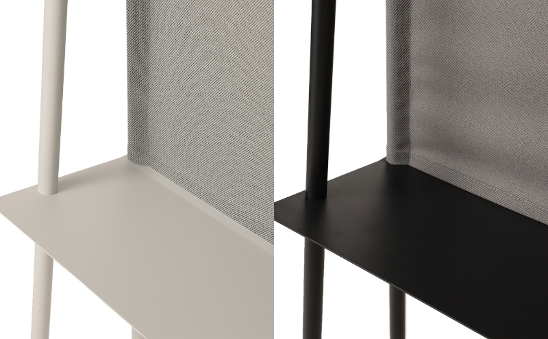 サテンブラック:つや消しのブラックで高級感があり、背面の布と調和し、鋼製家具にはない柔らかさを演出します。