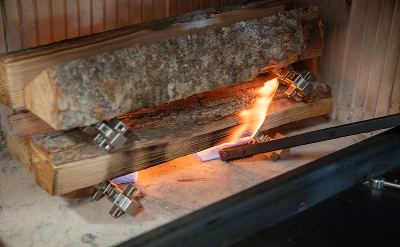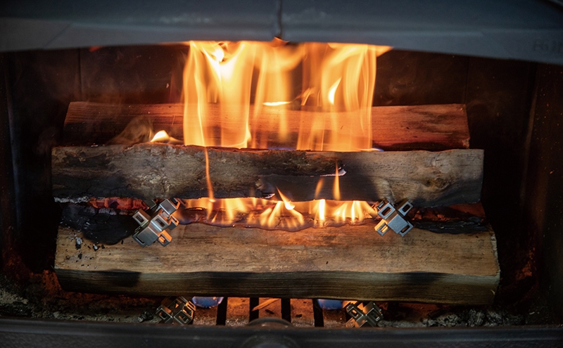 『薪一発』は、特許取得済みの十字型キューブを連結した薪ストーブ用の着火補助ツールです。各凸部が炉床と薪との間に空間をつくり、空気の流れを確保することで効率的な燃焼を実現します。