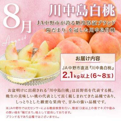 1回目お届けの桃はJA中野市の誇る糖度保証ブランド「陽だまり」を冠した川中島白桃を2.1kg以上(6~8玉)でお送りします。